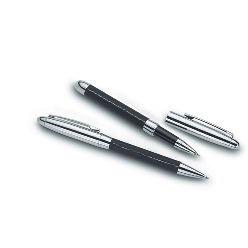 Sheated in PU leather pen set with ball pen and roller pen, presented in a zipped pouch with contrasting stitching. Black ink.